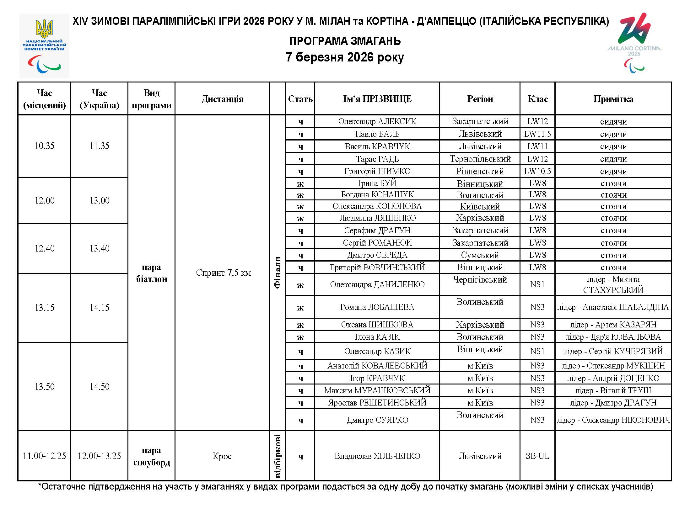 Програма змагань 7 березня 2026 року